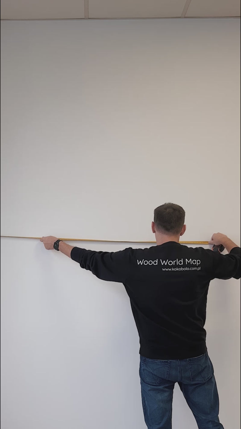 Montaż - Wszystko, co potrzebne do zamontowania drewnianej mapy, znajduje się w pudełku: taśma dwustronna, tekturowy szablon do montażu na ścianie oraz instrukcje.