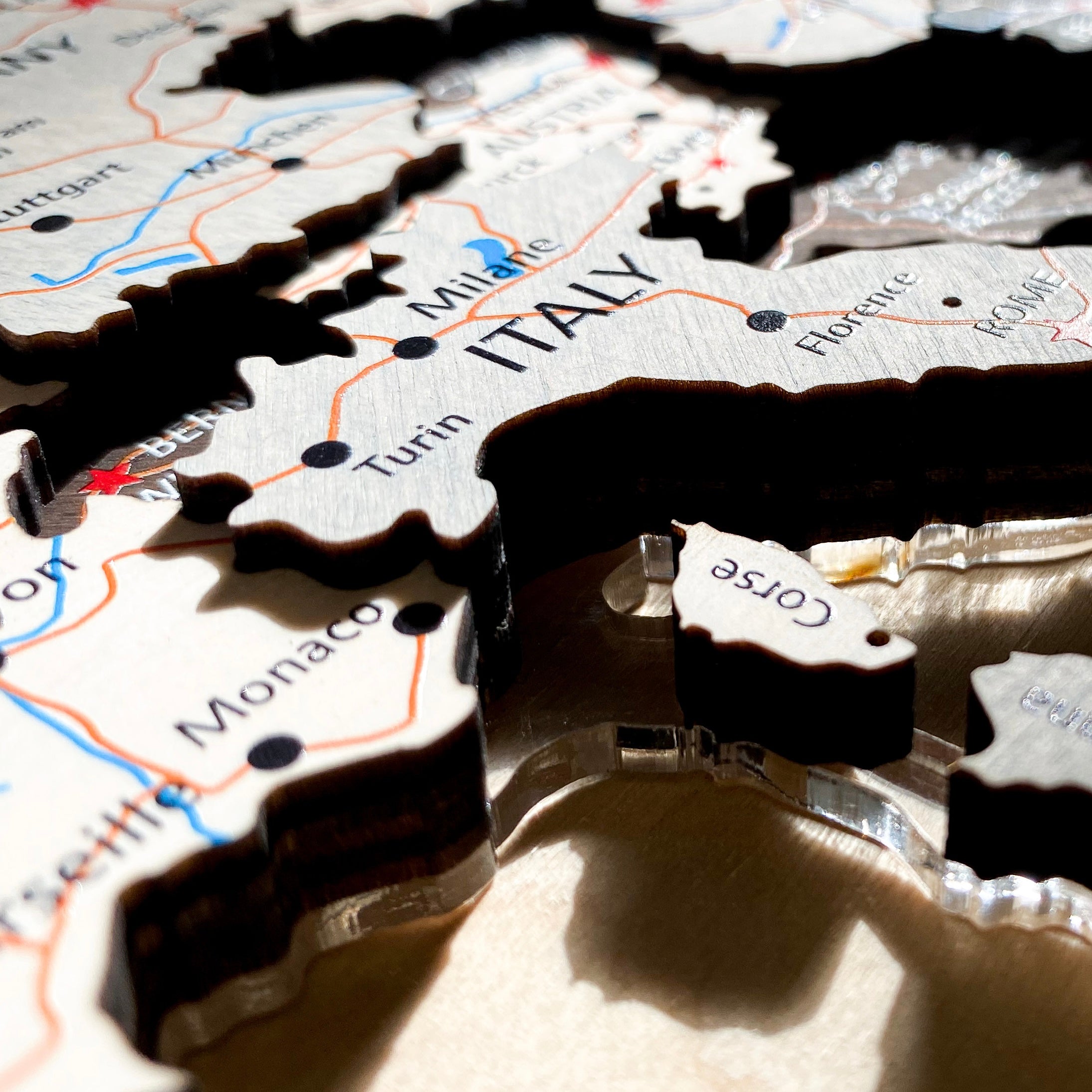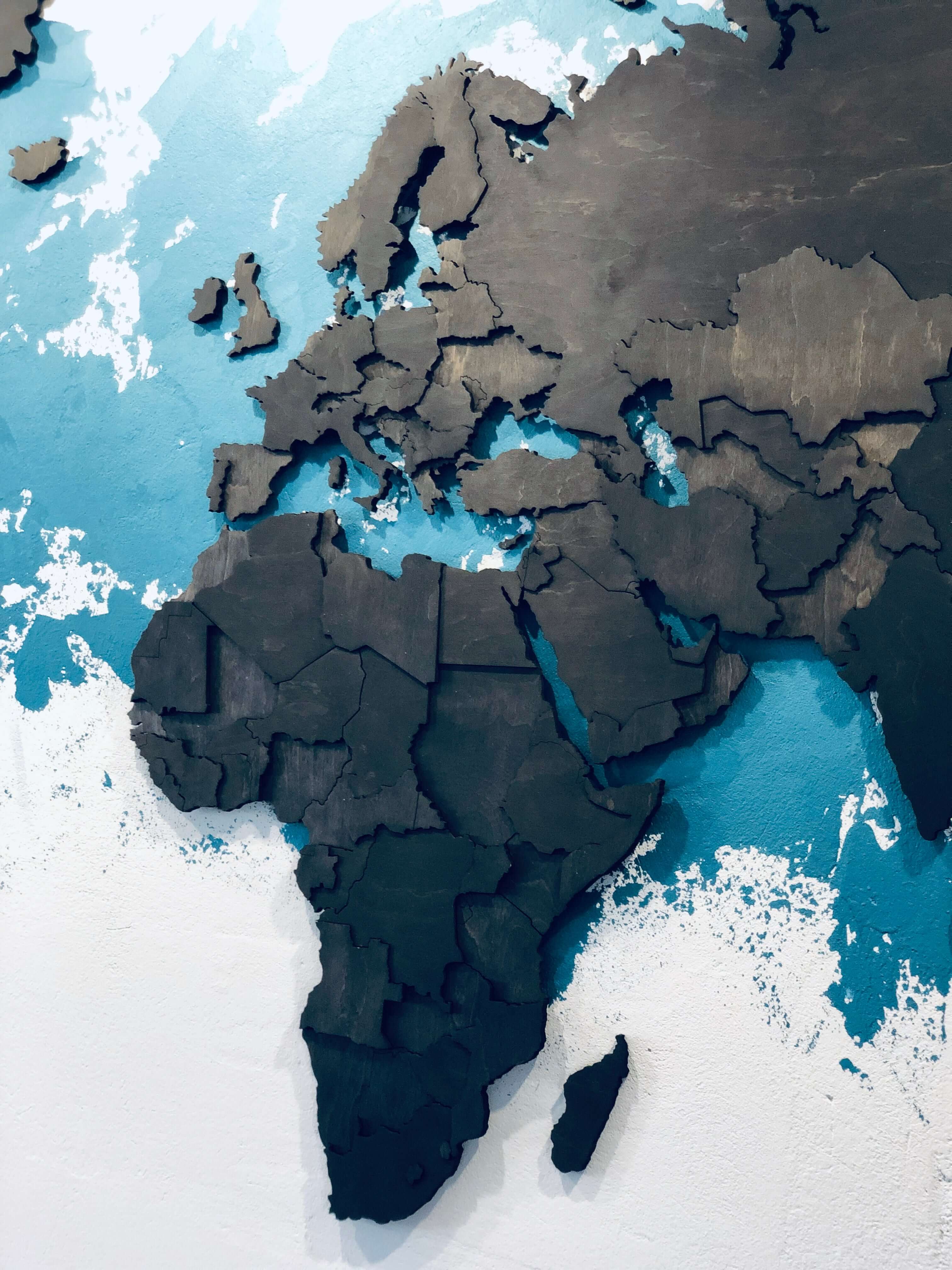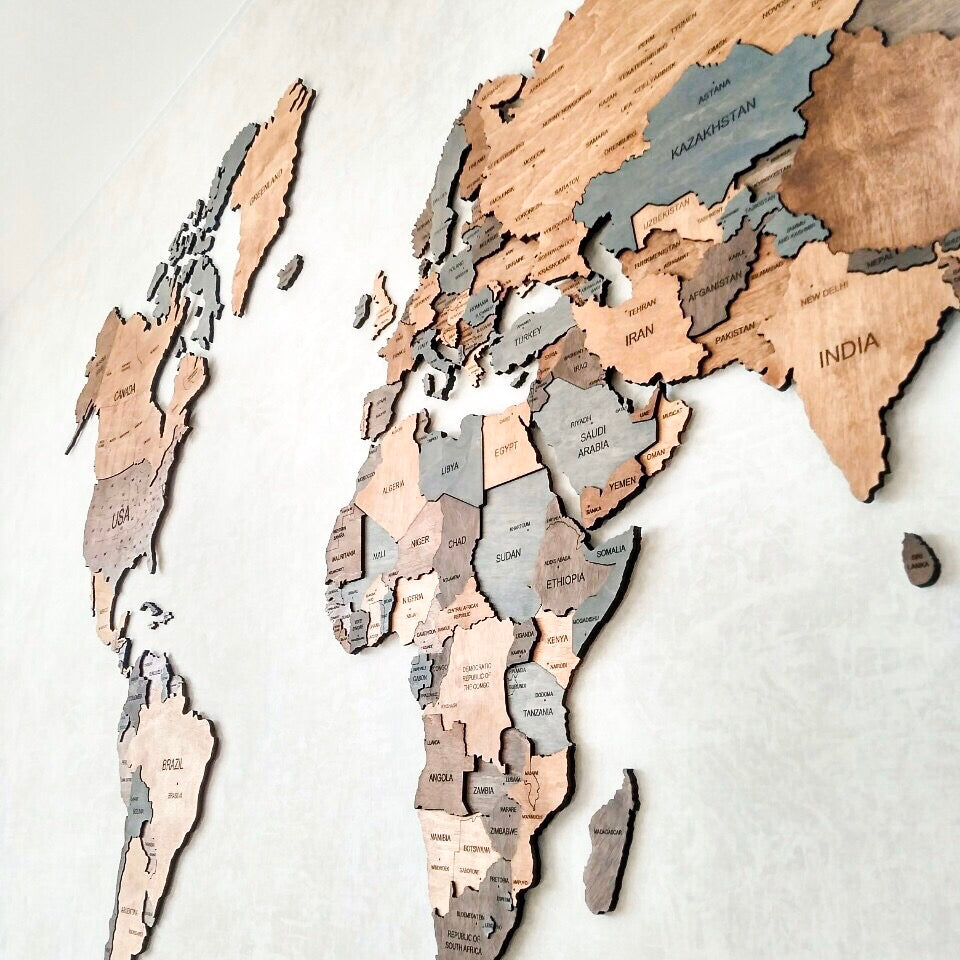 Jeśli przyjrzysz się jej bliżej, zauważysz, że niemal każdy kraj różni się nie tylko kolorem, ale i wysokością. Choć użyliśmy zaledwie czterech kolorów i trzech warstw drewna, każdy fragment jest wyjątkowy – tak jak każdy zakątek świata.