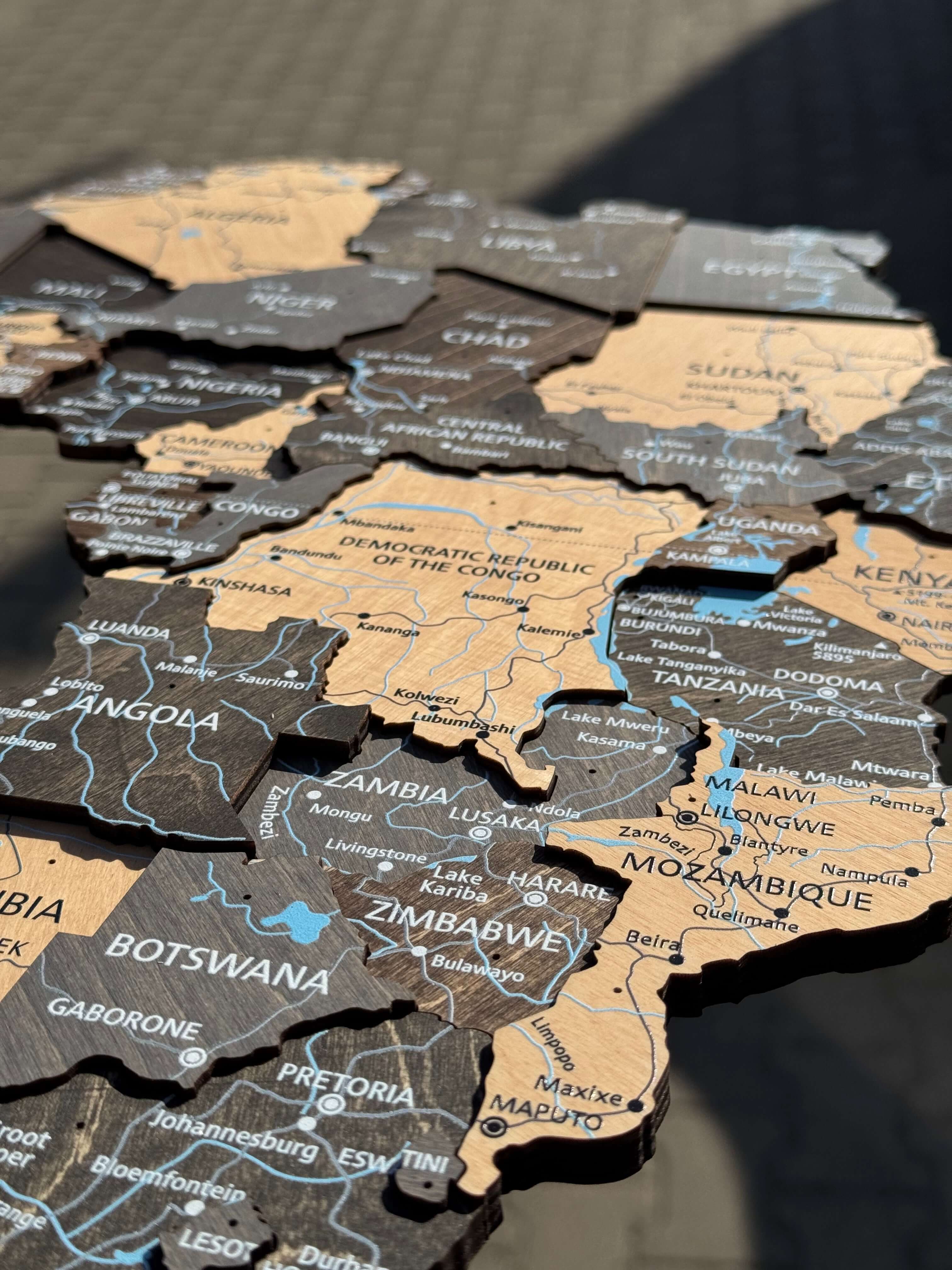 Druk - Wysokiej jakości druk UV nazw krajów, miast, rzek, jezior, dróg oraz innych elementów na drewnianej mapie.